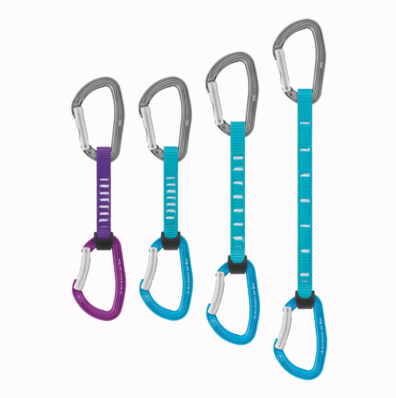 – protezione di fettuccia STRING per stabilizzare il moschettone nell’aggancio. - Disponibile in tre lunghezze: 12 (turchese o viola), 17 e 25 cm.