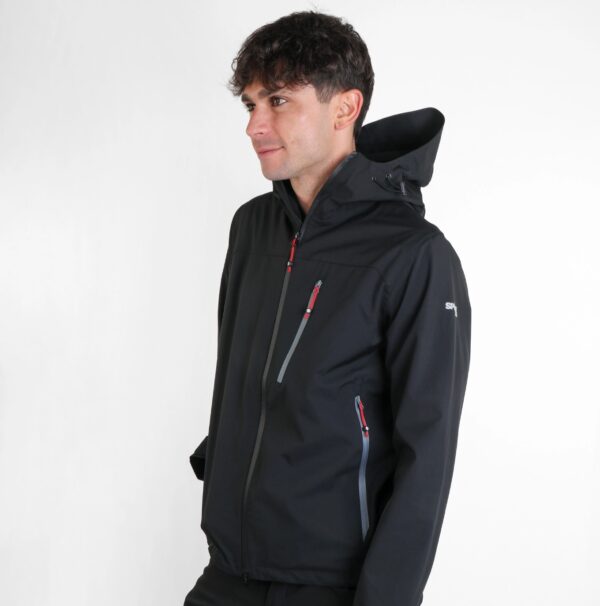 : Chiusura centrale e tasche con cerniere invertite resistenti all’acqua, polsini con velcro, cappuccio con cordino elastico regolabile, cerniera di ventilazione sotto le ascelle, protezione per il mento, logo riflettente, cordino elastico regolabile al fondo, termosaldate.