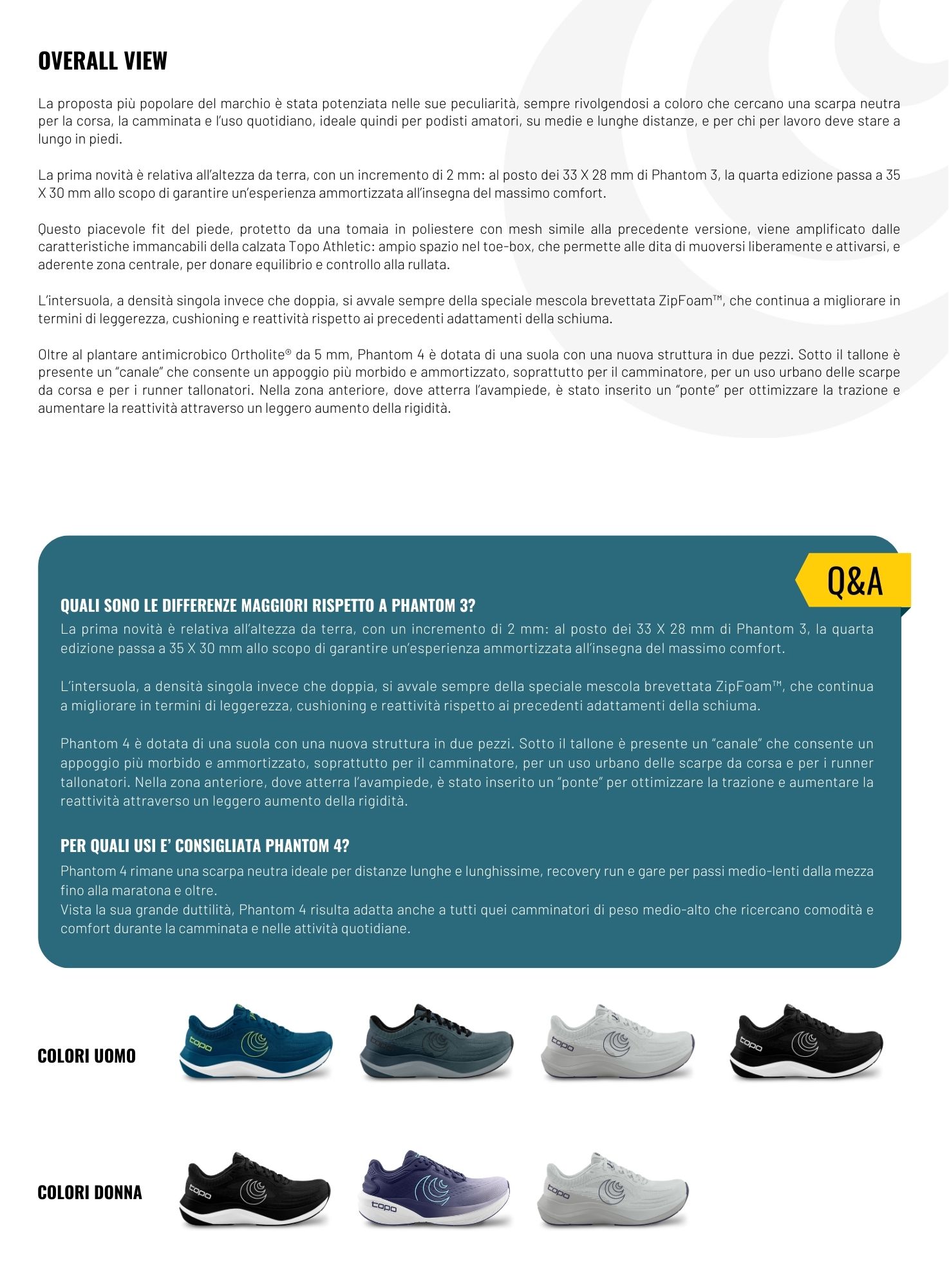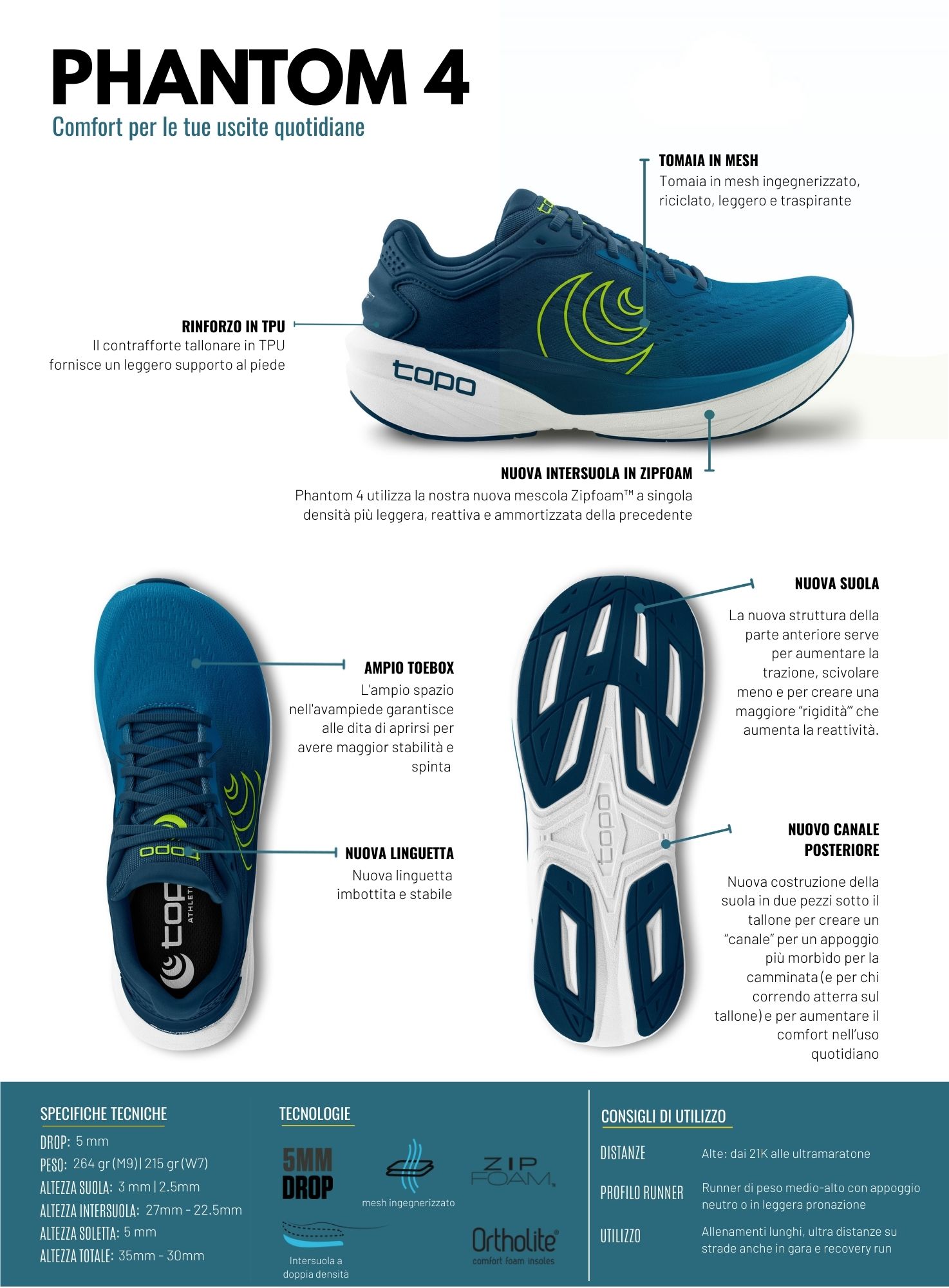 Un aggiornamento del modello più popolare della linea Topo, Phantom 4 continua a fungere da nostra scarpa running neutra quotidiana ad alta ammortizzazione.